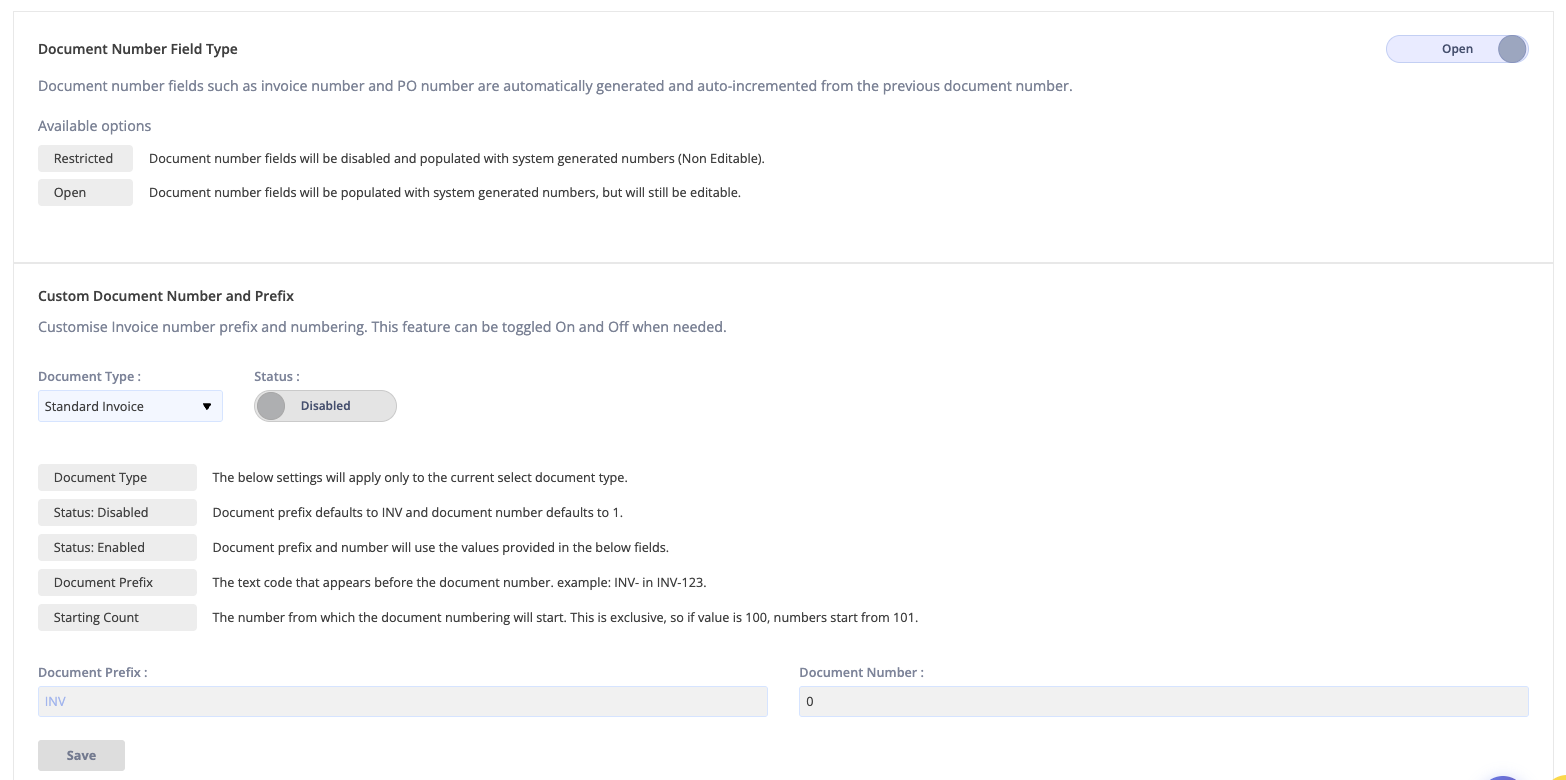 Prefix field, you can change the default text (e.g., change INV- to ACME-INV-).Starting Number field, enter the number you want the sequence to begin from. For example, if you enter 1001, the first invoice generated will be [YourPrefix]-1001.Remember to click "Save" at the bottom of the page to apply your changes.